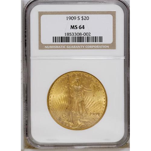 <B>1909-S $20 MS64 NGC.</B></I> Wheat-gold surfaces exude soft luster and a few minor contact marks. The design elements are exceptionally well impressed.<BR><BR><b>Shipping:</b> Coin/Currency (<a target="_blank" href="http://www.heritageauctions.com/common/shipping.php">view shipping information</a>)