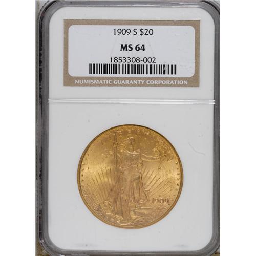 <B>1909-S $20 MS64 NGC.</B></I> Wheat-gold surfaces exude soft luster and a few minor contact marks that are consistent with the grade. The design elements are exceptionally well impressed.<BR><BR><b>Shipping:</b> Coins & Currency (<a target="_blank" href="http://www.heritageauctions.com/common/shipping.php">view shipping information</a>)