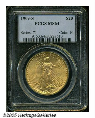 1909-S $20 MS64 PCGS. A lustrous, fully struck ex