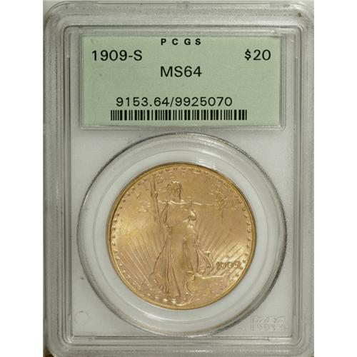 <B>1909-S $20 MS64 PCGS.</B></I> A softly lustrous yellow-orange near-Gem from this early Saint-Gaudens double eagle. Hints of green appear at the obverse periphery, as do light, scattered marks like those that affect the devices.<BR><BR><b>Shipping:</b> Coin/Currency (<a target="_blank" href="http://www.heritageauctions.com/common/shipping.php">view shipping information</a>)