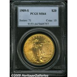 <B>1909-S $20 MS64 PCGS.</B></I> Although a plentiful date, this issue is seldom found with so much eye appeal. It is sharply struck and has excellent yellow-gold luster with deeper honey-gold toning.