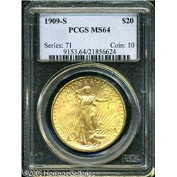<B>1909-S $20 MS64 PCGS.</B></I> Blazing luster and clean fields attest to the quality of this straw-gold near-Gem. The strike is intricate on Liberty's face and hands. Lot:9494