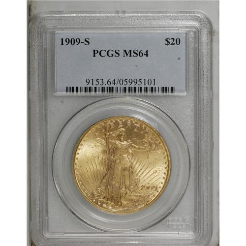 <B>1909-S $20 MS64 PCGS.</B></I> Choice with strongly lustrous wheat-gold surfaces. The strike is adequate, though a trifle soft on the torch hand, and minor marks pepper the surfaces.<BR><BR><b>Shipping:</b> Coin/Currency (<a target="_blank" href="http://www.heritageauctions.com/common/shipping.php">view shipping information</a>)