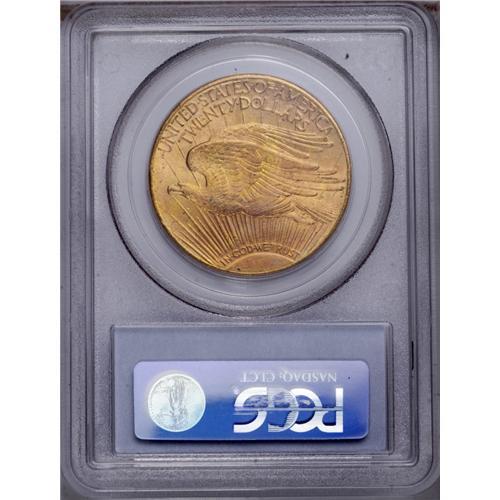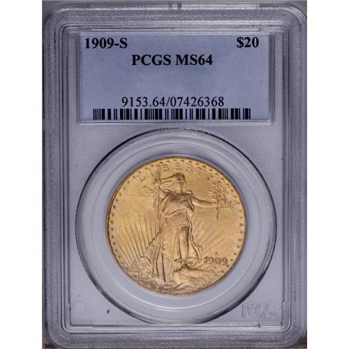<B>1909-S<$20> MS64 PCGS.</B></I> Lustrous apricot-gold surfaces are minimally abraded, except for one moderate mark in the right obverse field to the right of Liberty's knee. The design elements are nicely struck throughout and the mintmarks tilts noticeably to the left.