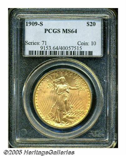 1909-S $20 MS64 PCGS. Nice dark-golden color, goo