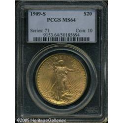 <B>1909-S $20 MS64 PCGS.</B></I> Pale rose and gold color with brilliant luster and excellent eye appeal for the grade. Although plentiful in this grade, Gem quality examples of this issue are seldom encountered. Lot:9495