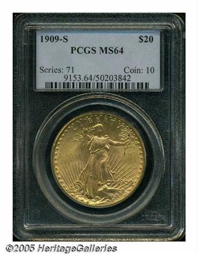 <B>1909-S<$20> MS64 PCGS.</B></I> Sharply struck with full satin luster and lovely red-gold coloration, evenly distributed over both sides. A few scattered contact marks prevent a higher grade designation for this generally attractive near-Gem.