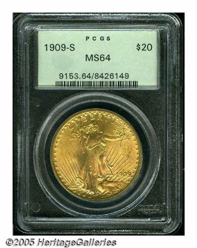 <B>1909-S<$20> MS64 PCGS.</B></I> The apricot-gold surfaces are lustrous and only lightly marked. A well struck older holder near-Gem.<BR><I>Ex: ANA Bullet (Heritage, 8/95), lot 1592, which realized $963.</B></I><BR><I>From The Stig Ericsson Collection.</B></I>