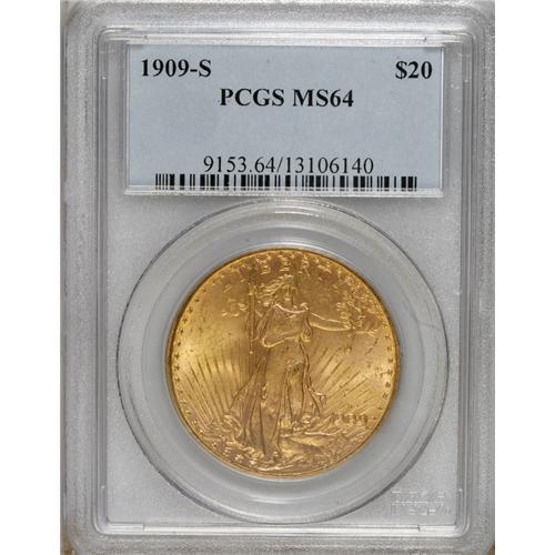 <B>1909-S $20 MS64 PCGS.</B></I> This softly lustrous and well struck yellow-gold near-Gem displays glints of orange at the margins. An attractive example of this early With Motto issue, one that had a generous mintage of over 2.7 million pieces.<BR><BR><b>Shipping:</b> Coins & Currency (<a target="_blank" href="http://www.heritageauctions.com/common/shipping.php">view shipping information</a>)