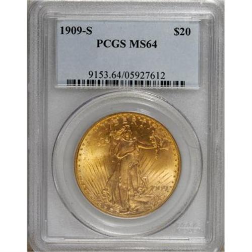 <B>1909-S $20 MS64 PCGS.</B></I> An upper-end example of this popular hoard date. Fully struck with strong mint luster. A loupe will be necessary to find the abrasions that limit the grade on this sharp coin.<BR><BR><b>Shipping:</b> Coins & Currency (<a target="_blank" href="http://www.heritageauctions.com/common/shipping.php">view shipping information</a>)