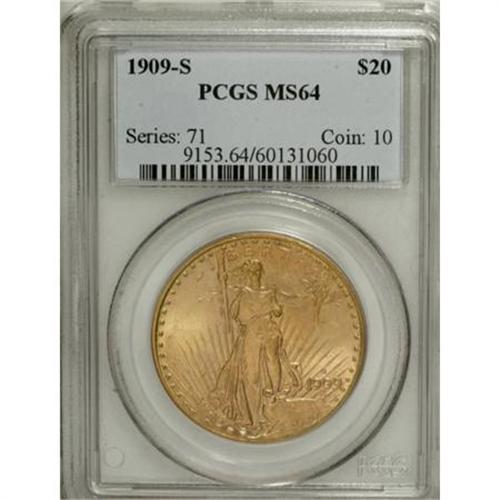 <B>1909-S $20 MS64 PCGS.</B></I> Attractive apricot-gold and mint-green colors intermingle over the radiantly lustrous surfaces of this near-Gem, and an exquisite strike emboldens the design features. Just a few trivial marks away from full Gem.<BR><BR><B>Coin Engraver:</B> Augustus Saint-Gaudens<BR><BR><b>Shipping:</b> Coins & Currency (<a target="_blank" href="http://www.heritageauctions.com/common/shipping.php">view shipping information</a>)