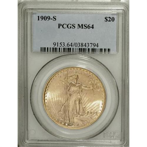 <B>1909-S $20 MS64 PCGS.</B></I> This bright canary-gold twenty dollar piece has potent luster and a suitable strike. Small marks on the obverse and eagle are typical for the assigned grade.<BR><BR><B>Coin Engraver:</B> Augustus Saint-Gaudens<BR><BR><b>Shipping:</b> Coins & Currency (<a target="_blank" href="http://www.heritageauctions.com/common/shipping.php">view shipping information</a>)