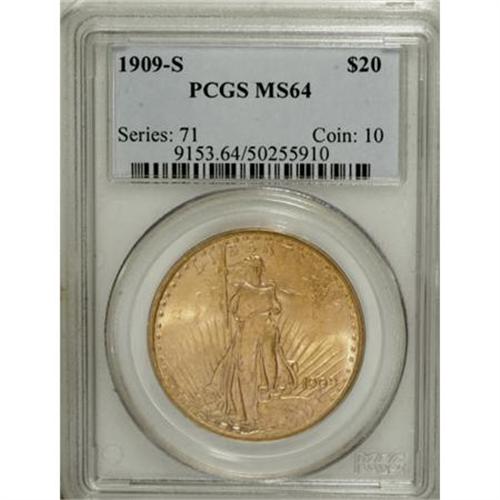 <B>1909-S $20 MS64 PCGS.</B></I> This orange-gold double eagle possesses booming luster and is nicely struck. Evaluation with a lens locates distributed small marks.<BR><BR><B>Coin Engraver:</B> Augustus Saint-Gaudens<BR><BR><b>Shipping:</b> Coins & Currency (<a target="_blank" href="http://www.heritageauctions.com/common/shipping.php">view shipping information</a>)
