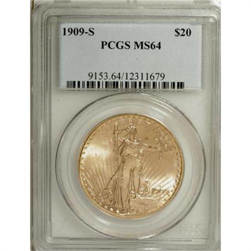 <B>1909-S $20 MS64 PCGS.</B></I> Pale straw-gold surfaces offer powerful, swirling luster. A lovely, crisply struck Choice coin that shows only a few minor abrasions on and near Liberty's legs.<BR><BR><B>Coin Engraver:</B> Augustus Saint-Gaudens<BR><BR><b>Shipping:</b> Coins & Currency (<a target="_blank" href="http://www.heritageauctions.com/common/shipping.php">view shipping information</a>)
