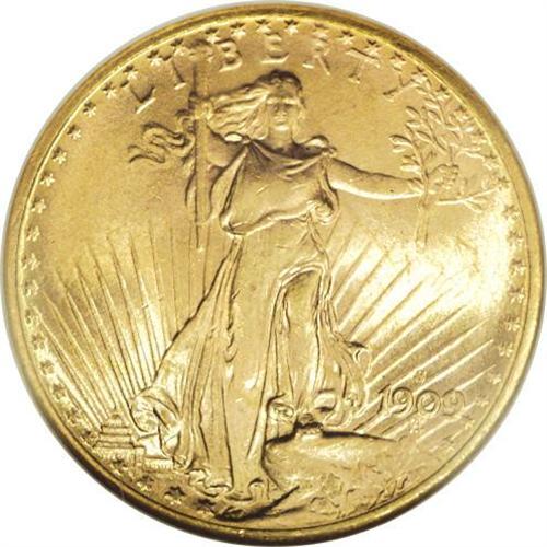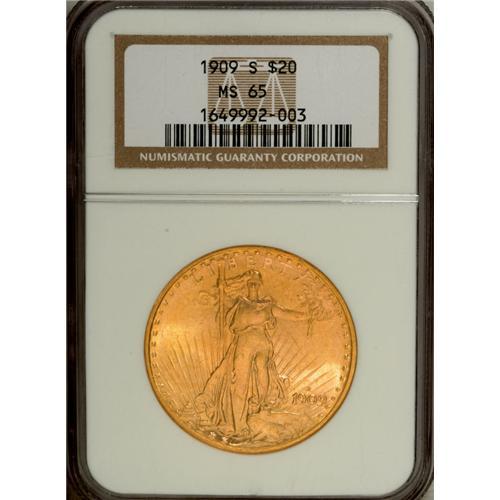 <B>1909-S $20 MS65 NGC.</B></I> Sharply struck and fully brilliant with lovely light gold-orange luster accented by hints of pink and olive. Although this date, from a substantial mintage of nearly 3 million coins, is considered a common date, it is elusive in the Gem MS65 grade and rare any finer.<BR><BR><b>Shipping:</b> Coin/Currency (<a target="_blank" href="http://www.heritageauctions.com/common/shipping.php">view shipping information</a>)