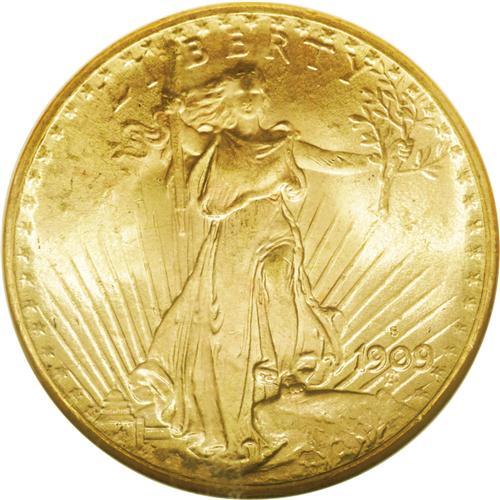 <B>1909-S $20 MS65 NGC.</B></I> This is a frosty and beautiful Gem, obviously original and displaying fine pink and golden-orange colors. There are no mentionable abrasions on either side. Mint State examples of this issue are often nice, but only seldom are they of Gem quality. Census: 181 in 65, 5 finer (1/06).
