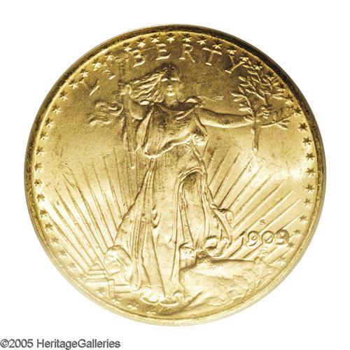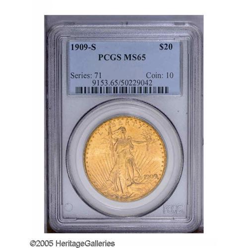 <B>1909-S<$20> MS65 PCGS.</B></I> A satiny Gem, obviously original and without any appreciable surface marks. Bright copper-golden luster abounds overall. Mint State examples of this issue are often nice, but seldom Gem quality. Population: 160 in 65, 5 finer (11/05).
