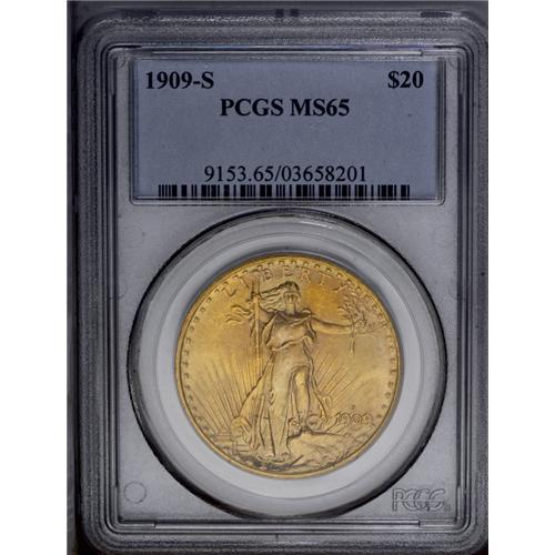 <B>1909-S<$20> MS65 PCGS.</B></I> This date is one of the most available S-Mint issues in the entire double eagle series, with the exception of a couple dates in the middle teens. Gem quality examples, however, are elusive, and higher grade pieces are essentially non-existent. This is a lovely Gem with rich and frosty luster and splendid orange-gold coloration. The surfaces are essentially pristine with only a few tiny flaws. It has the overall eye appeal of an even higher grade example. Population: 157 in 65, 5 finer (3/06). <BR><BR><B>Important notice:</B> Heritage usually auctions material at the rate of 200-250 lots per hour. On some occasions eBay Live bid software or the Internet may not be able to keep up with the pace of the auction. We recommend placing a realistic absentee bid now as insurance to avoid disappointment. Occasionally the auctioneer may eliminate or reject an eBay Live bid, and the auctioneer may also reopen a lot after the close of the eBay live bidding (usually because we missed an audience bid), and may reject your bid even if it shows you as the winning bidder. By bidding via eBay Live, you agree that Heritage may award the lot to another bidder at its sole discretion under the circumstances described above or any other reasonable circumstances. Since eBay bids are not shown to us until we open the lot on the floor, we treat those bids just like floor bids. In most cases the floor responds before the eBay bid is presented to us, due to Internet lag time, so for consistency we have made it a policy that floor bids are always considered first over tie eBay live bids. Also please note that all Heritage lots purchased through eBay Live carry a 20% Buyer's Premium. Please make sure you read the Terms and Conditions before you bid. This lot is being auctioned in conjunction with a live floor auction by Heritage Galleries & Auctioneers. All final auction and invoice information will be supplied by Heritage Galleries & Auctioneers, and all other information should be considered preliminary. Lot:4586 <BR><BR><B>Winning Notification and Billing:</B> After the FINAL session in this auction is complete, Heritage will send e-mail and snail mail invoices. This process normally takes several days. All final auction and invoice information will be supplied by Heritage Galleries & Auctioneers, and all other information should be considered preliminary. <BR><BR>This auction will be conducted on a live auction floor and over the Internet through eBay Live. If you choose to place an absentee bid, please take a moment to <font color='#0000ff'><u><a href='http://pages.ebay.com/liveauctions/help/before/laabsentee.html'>learn how eBay Live absentee bidding works</a></u></font><font color='#000000'>