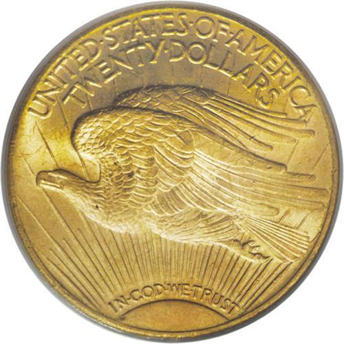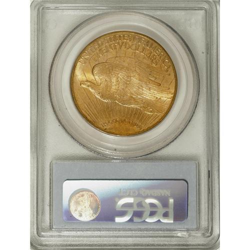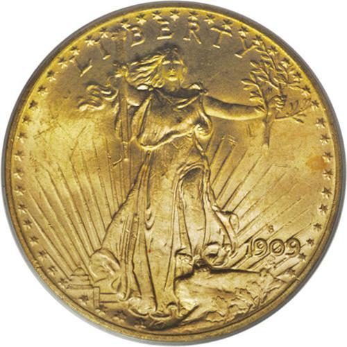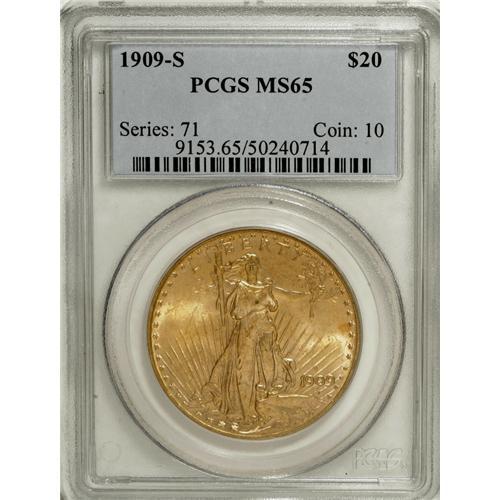 <B>1909-S $20 MS65 PCGS.</B></I> With a mintage of 2.7 million pieces, the 1909-S is readily available through MS64, mostly because of a bag that came on the market in 1989. It becomes much more challenging in full Gem, and rare in the higher grades of Mint State. The Gem offered here displays peach-gold patina with subtle orange accents. Bright luster radiates from both sides, and all of the design elements are well brought up. Sharp definition is noted on Liberty's face, fingers, and toes, and on the eagle's feathers. The Capitol dome, on the other hand, is somewhat soft. A few minute marks over each side are not noteworthy.<BR><BR><b>Shipping:</b> Coins & Currency (<a target="_blank" href="http://www.heritageauctions.com/common/shipping.php">view shipping information</a>)