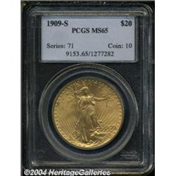 <table><tbody><tr><td><table> <TR><TD width="100%"><TABLE cellSpacing=1 cellPadding=3 width="100%" border=0><TBODY><TR><TD width="100%" bgColor=#79735c><FONT face=arial color=#ffffff size=3><B>Description</B> </FONT></TD></TR><TR><TD width="100%" bgColor=#ffffff><FONT face=arial size=2><B>1909-S $20 MS65 PCGS.</B></I> After the hoard of 1909-S Saints entered the market some 15 years ago, this has become one of the more available issues among the early issues in the series. But it is still a scarce and important coin in Gem condition. The surfaces display the reddish tinged mint frost that is usually seen on this issue and the striking details are fully defined in all areas. However, unlike most of the El Salvador Hoard pieces, this one shows only the slightest post-striking impairments. Exceptional quality. Population: 51 in 65, 2 finer (10/03).<BR><I>From a Magnificent Collection of Double Eagles.</B></I> </FONT></TD></TR></TBODY></TABLE></TD></TR></TBODY></TABLE><BR><A name=PricesRealized></A><TABLE cellSpacing=0 cellPadding=0 width="100%" bgColor=#000000 border=0><TBODY><TR><TD width="100%"><TABLE cellSpacing=1 cellPadding=3 width="100%" border=0><TBODY><TR><TD width="100%" bgColor=#79735c><A name=PR><FONT face=arial color=#ffffff size=3><B>Previous Prices from Heritage Auctions</B> </FONT></A></TD></TR><TR><TD bgColor=#f6f6ed><TABLE cellSpacing=0 cellPadding=0 width="100%" border=1><TBODY><TR><TD align=middle width="33%"><B>Date</B></TD><TD align=middle width="33%"><B>Service</B></TD><TD align=middle width="33%"><B>Price</B></TD></TR><TR bgColor=whitesmoke><TD width="33%"><B>06/03/2003</B></TD><TD width="33%">PCGS</TD><TD width="33%">$5,635.00</TD></TR><TR bgColor=whitesmoke><TD width="33%"><B>01/07/2004</B></TD><TD width="33%">NGC</TD><TD width="33%">$4,887.50</TD></TR><TR bgColor=whitesmoke><TD width="33%"><B>09/20/2003</B></TD><TD width="33%">NGC</TD><TD width="33%">$4,830.00</TD></TR><TR bgColor=whitesmoke><TD width="33%"><B>06/08/2002</B></TD><TD width="33%">PCGS</TD><TD width="33%">$4,715.00</TD></TR><TR bgColor=whitesmoke><TD width="33%"><B>02/23/2001</B></TD><TD width="33%">PCGS</TD><TD width="33%">$3,910.00</TD></TR><TR bgColor=whitesmoke><TD width="33%"><B>06/06/1998</B></TD><TD width="33%">PCGS</TD><TD width="33%">$4,370.00</TD></TR><TR bgColor=whitesmoke><TD width="33%"><B>03/01/1998</B></TD><TD width="33%">NGC</TD><TD width="33%">$3,080.00</TD></TR><TR bgColor=whitesmoke><TD width="33%"><B>03/01/1998</B></TD><TD width="33%">NGC</TD><TD width="33%">$3,080.00</TD></TR></TBODY></TABLE></TD></TR><TR><TD bgColor=#ffffff><FONT face=arial size=1 ?>PLEASE NOTE: All prices realized reflect the final hammer price PLUS the buyer's premium in auctions that charge a buyer's premium. Each item has a notation at the top of the listing indicating whether that lot included a buyer's premium. Example: A item that sells with a final hammer price of $100 and a 20% buyer's premium will display with a price realized of $120. All information listed is intended to be as accurate as possible, but errors are possible. Please use this guide carefully and inform us of any inaccuracies. </FONT></TD></TR></TBODY></TABLE></TD></TR></TBODY></TABLE><BR><TABLE cellSpacing=0 cellPadding=0 width="100%" bgColor=#000000 border=0><TBODY><TR><TD width="100%"><TABLE cellSpacing=1 cellPadding=3 width="100%" border=0><TBODY><TR><TD width="100%" bgColor=#79735c colSpan=6><FONT face=arial color=#ffffff size=3><B>Price Guide*</B> </FONT></TD></TR><TR bgColor=#f6f6ed><TD align=middle><B>Grade</B> </TD><TD align=middle><B>Coin World<BR>(Trends)</B> </TD><TD align=middle><B>Numismedia<BR>Retail</B> </TD><TD align=middle><B>Numismedia<BR>Wholesale</B> </TD><TD align=middle><B>Coin<BR>Universe</B> </TD><TD align=middle><B>Heritage<BR>Value Index</B> </TD></TR><TR bgColor=#ffffff><TD align=middle>64</TD><TD align=right>$1,800.00</TD><TD align=right>---</TD><TD align=right>$825.00</TD><TD align=right>$1,375.00</TD><TD align=right>$1,088.13</TD></TR><TR style="FONT-WEIGHT: bold" bgColor=#cccfdd><TD align=middle>65</TD><TD align=right>$6,500.00</TD><TD align=right>---</TD><TD align=right>$4,125.00</TD><TD align=right>$6,500.00</TD><TD align=right>$5,116.75</TD></TR><TR bgColor=#ffffff><TD align=middle>66</TD><TD align=right>---</TD><TD align=right>---</TD><TD align=right>$12,500.00</TD><TD align=right>---</TD><TD align=right>$5,458.50</TD></TR><TR bgColor=#ffffff><TD colSpan=6><FONT size=1>*All information listed is intended to be as accurate as possible, but errors are possible. No item may be returned or refused based on this information which is provided as a service to our customers. You should contact each pricing source directly to determine the accuracy of this information. </FONT></TD></TR></TBODY></TABLE></TD></TR></TBODY></TABLE><BR><TABLE cellSpacing=0 cellPadding=0 width="100%" bgColor=#000000 border=0><TBODY><TR><TD width="100%"><TABLE cellSpacing=1 cellPadding=3 width="100%" border=0><TBODY><TR><TD width="100%" bgColor=#79735c><FONT face=arial color=#ffffff size=3><B>Population Guide</B> </FONT></TD></TR><TR bgColor=#ffffff><TD align=middle><!-- Begin Output of Population Grid--><TABLE cellSpacing=0 cellPadding=0 width="100%" border=0><TBODY><TR><TD vAlign=center><TABLE cellSpacing=0 width="100%" border=1 cellsadding="3"><TBODY><TR><TD vAlign=center><TABLE cellSpacing=0 cellPadding=3 width="100%" border=1><TBODY><TR><TD vAlign=center align=middle bgColor=#f0f1e8 colSpan=2 <CENTER><FONT face=Arial size=2><B>PCGS Pop </B></FONT><CENTER></CENTER></TD><TD vAlign=center align=middle bgColor=#f0f1e8 colSpan=2><CENTER><FONT face=Arial size=2><B>NGC Pop</B></CENTER></FONT></TD></TR><TR><TD vAlign=center><FONT face=Arial size=2>(65)</FONT> </TD><TD vAlign=center align=right><FONT face=Arial size=2>51</FONT> </TD><TD vAlign=center><FONT face=Arial size=2>(65)</FONT> </TD><TD vAlign=center align=right><FONT face=Arial size=2>119</FONT> </TD></TR><TR><TD vAlign=center><FONT face=Arial size=2>(>65)</FONT> </TD><TD vAlign=ce