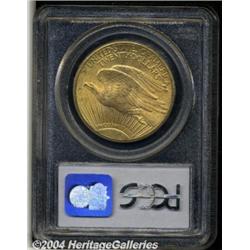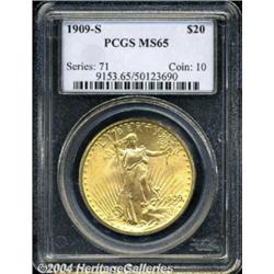 <B>1909-S<$20> MS65 PCGS.</B></I> This is a frosty and beautiful Gem, obviously original and displaying fine pink and golden-orange colors. There are several notable abrasions near the reverse center, but the obverse only shows a few minor blemishes. Mint State examples of this issue are often nice, but only seldom are they of Gem quality. <BR><BR><B>Important notice:</B> Heritage usually auctions material at the rate of 200-250 lots per hour. On some occasions eBay Live bid software or the Internet may not be able to keep up with the pace of the auction. We recommend placing a realistic absentee bid now as insurance to avoid disappointment. Occasionally the auctioneer may eliminate or reject an eBay Live bid, and the auctioneer may also reopen a lot after the close of the eBay live bidding (usually because we missed an audience bid), and may reject your bid even if it shows you as the winning bidder. By bidding via eBay Live, you agree that Heritage may award the lot to another bidder at its sole discretion under the circumstances described above or any other reasonable circumstances. Since eBay bids are not shown to us until we open the lot on the floor, we treat those bids just like floor bids. In most cases the floor responds before the eBay bid is presented to us, due to Internet lag time, so for consistency we have made it a policy that floor bids are always considered first over tie eBay live bids. Also please note that all Heritage lots purchased through eBay Live carry a 20% Buyer's Premium. Please make sure you read the Terms and Conditions before you bid. </span></font></tr></table></td></tr></table>