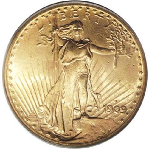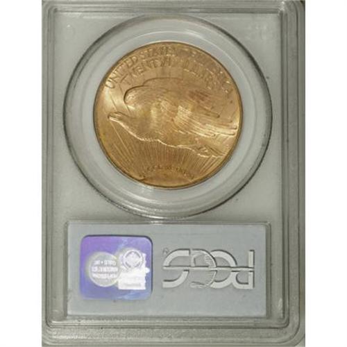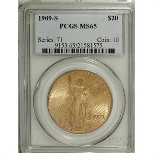 <B>1909-S $20 MS65 PCGS.</B></I> A carefully preserved and unusually appealing representative of this early With Motto issue, solidly struck with rich sunset-orange color and distinctive aqua overtones. A hint of rose color also appears on the eagle's upper wing. Despite a generous mintage of over 2.7 million pieces, this issue is a condition rarity any finer, with just seven such pieces certified by PCGS (6/07).<BR><BR><B>Coin Engraver:</B> Augustus Saint-Gaudens<BR><BR><b>Shipping:</b> Coins & Currency (<a target="_blank" href="http://www.heritageauctions.com/common/shipping.php">view shipping information</a>\)