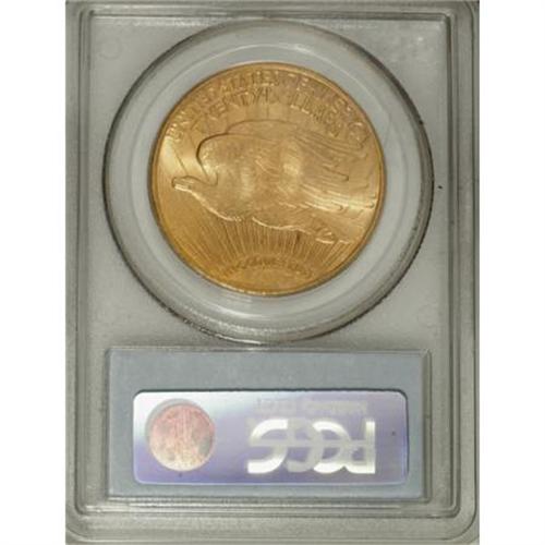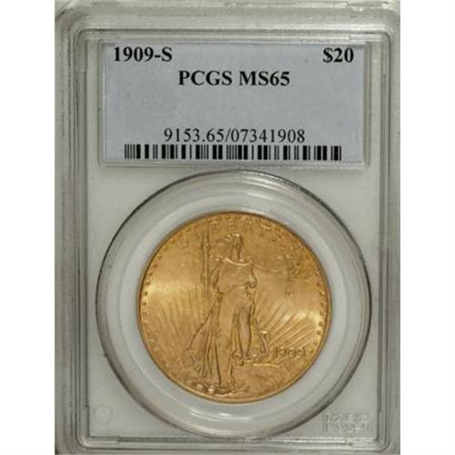 <B>1909-S $20 MS65 PCGS.</B></I> The mintmark is obviously repunched. The striking details are as bold as any that we have seen in recent years, on a 1909-S Saint-Gaudens twenty. Liberty's face and right (facing) hand are especially sharp. The reddish-golden surfaces show matte-like fields and faint accents of silver-blue on both sides. A small abrasion directly below Liberty's right (facing) elbow prevents an even finer grade designation. <BR><BR><B>Coin Engraver:</B> Augustus Saint-Gaudens<BR><BR><b>Shipping:</b> Coins & Currency (<a target="_blank" href="http://www.heritageauctions.com/common/shipping.php">view shipping information</a>)