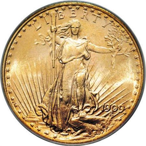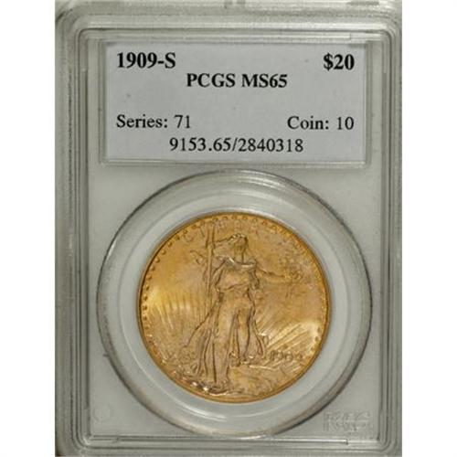 <B>1909-S $20 MS65 PCGS.</B></I> It isn't Breen-7375, but the mintmark is nonetheless nicely repunched southeast. Lemon-gold toning endows this highly lustrous and sharply impressed Gem. Minor contact on the thighs and upper obverse field are all that limits the grade. PCGS has certified only seven pieces finer (10/07).<BR><I>From The Parker Lee III Collection.</B></I><BR><BR><B>Coin Engraver:</B> Augustus Saint-Gaudens<BR><BR><b>Shipping:</b> Coins & Currency (<a target="_blank" href="http://www.heritageauctions.com/common/shipping.php">view shipping information</a>)