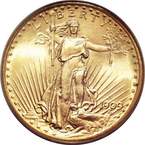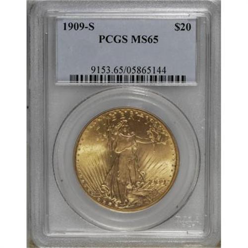 <B>1909-S $20 MS65 PCGS.</B></I> This Gem 1909-S twenty has the eye appeal of an even higher grade coin. Amazingly well preserved surfaces, blazing luster, and honey-gold coloration combine to make this a most memorable double eagle. As of (3/08), PCGS has graded only eight coins finer than the current offering. <BR><BR><B>Coin Engraver:</B> Augustus Saint-Gaudens<BR><BR><b>Shipping:</b> Coins & Currency (<a target="_blank" href="http://www.heritageauctions.com/common/shipping.php">view shipping information</a>)