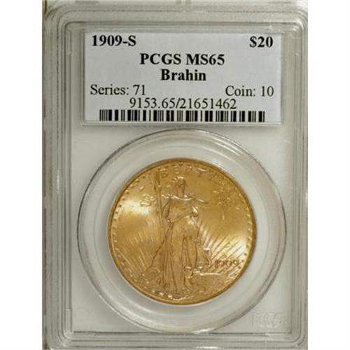 <B>1909-S $20 MS65 PCGS.</B></I> Ex: Brahin. Jay Brahin is currently ranked #1 in the NGC Registry for the Saint-Gaudens double eagle series. This is a lustrous and high-end Gem with rich honey-gold toning and a bold strike. The fields are remarkably smooth, and only a tick on Liberty's left (facing) leg denies an even finer grade.<BR><BR><B>Coin Engraver:</B> Augustus Saint-Gaudens<BR><BR><b>Shipping:</b> Coins & Currency (<a target="_blank" href="http://www.heritageauctions.com/common/shipping.php">view shipping information</a>)