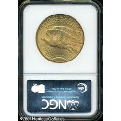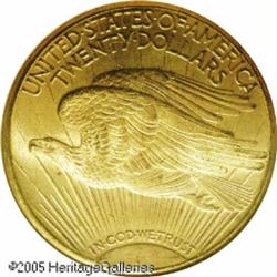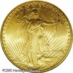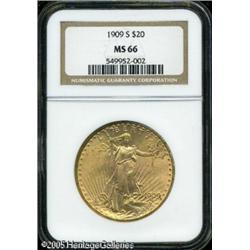 <B>1909-S $20 MS66 NGC.</B></I> After the hoard of 1909-S Saints entered the market several years ago, this has become one of the more available issues among the early issues in the series. But it is still a scarce and important coin in Gem condition. The surfaces display the reddish tinged mint frost that is usually seen on this issue and the striking details are fully defined in all areas. However, unlike most of the El Salvador Hoard pieces, this one shows only the slightest post-striking impairments. Exceptional quality. Population: 5 in 66, none are finer (1/05). Lot:9500