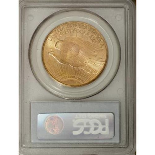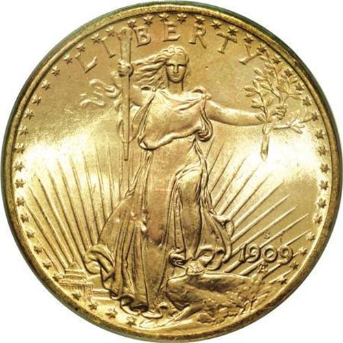 <B>1909-S $20 MS66 PCGS.</B></I> Gold specialist Roger Burdette, in his research at the National Archives, found that the San Francisco Mint used 13 obverse and 13 reverse dies to strike 2,829,416 double eagles in 1909. He notes that: "Of these, 54,491 (approximately two percent) were rejected by the cadre of lady adjustors who weighed each gold coin. This left a net production of 2,774,925 for commercial use. San Francisco was able to strike an average of 217,647 coins per die pair, or more than nine times the average of the Philadelphia Mint (23,198 per obverse die)."<BR> The current Premium Gem 1909-S possesses radiant luster and attractive peach-gold color augmented by occasional splashes of slightly deeper orange. Excellent strike definition prevails over the design elements, as revealed in the detail visible in Liberty's fingers on both hands as well as on the face and foot, on the Capitol building, and on the eagle's torso feathers. A few light marks in the field above the eagle's head serve to identify the coin. A remarkable example of an issue that proves virtually impossible to find any finer. Population: 6 in 66, 1 finer (11/07).<BR><I>From The Jacob Collection of Saint-Gaudens Double Eagles.</B></I><BR><BR><B>Coin Engraver:</B> Augustus Saint-Gaudens<BR><BR><b>Shipping:</b> Coins & Currency (<a target="_blank" href="http://www.heritageauctions.com/common/shipping.php">view shipping information</a>)