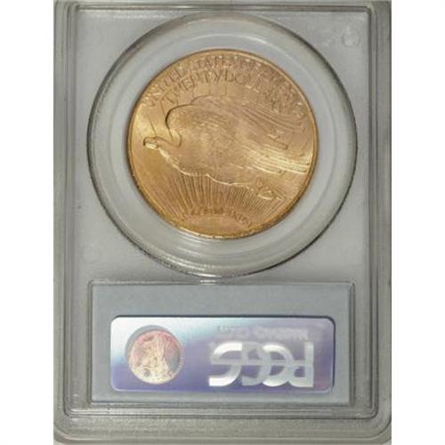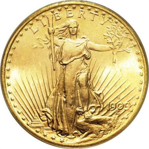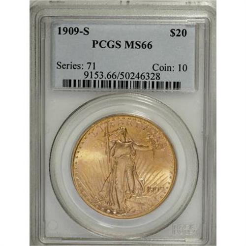 <B>1909-S $20 MS66 PCGS.</B></I> Although with an original mintage approaching 2.8 million pieces the 1909-S double eagle is an obtainable one, most Mint State examples found fall into the range between MS62 and MS64. Gem examples are rare, and in MS66 the present specimen is one of only seven coins so certified at PCGS, with one finer (3/08). NGC adds another eight coins to the total in MS66, with none finer.<BR> Fortunately for collectors, most 1909-S twenties are well produced, with a good strike and lustrous surfaces. The frosty surfaces of this marvelous piece are fairly mattelike, with appealing apricot-gold coloration and radiant cartwheel luster.<BR><BR><B>Coin Engraver:</B> Augustus Saint-Gaudens<BR><BR><b>Shipping:</b> Coins & Currency (<a target="_blank" href="http://www.heritageauctions.com/common/shipping.php">view shipping information</a>)