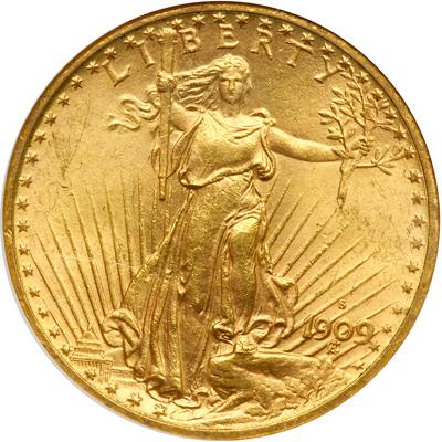 1909-S $20 St. Gaudens. NGC graded MS-63. Subdued golden toning. The choice brilliant example we now present bidders beats (from an aesthetic angle) many higher graded example that have passed through the various grading services (PCGS # 9153) .