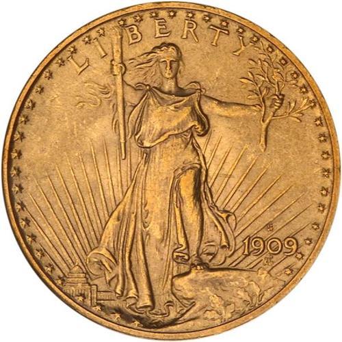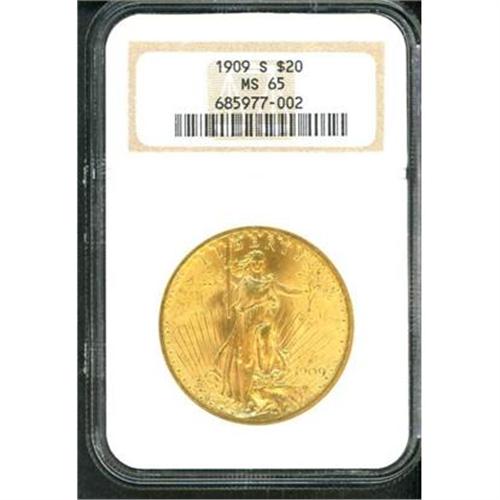 <b>1909-S $20 St. Gaudens. NGC graded MS65.</b> Aesthetically tempting, as fine a looking MS65 with full luster as you are apt to see, and all the while saturated with bright golden bloom, little in the way of toning. The devices were struck smack on the dot at the required force by the dies leaving all design elements plain and clear-cut, with not even an iota of weakness as found on some examples parading around in the same numerical grade. A charming S-mint twenty, to say the least! <b>(PCGS # 9153)</b>