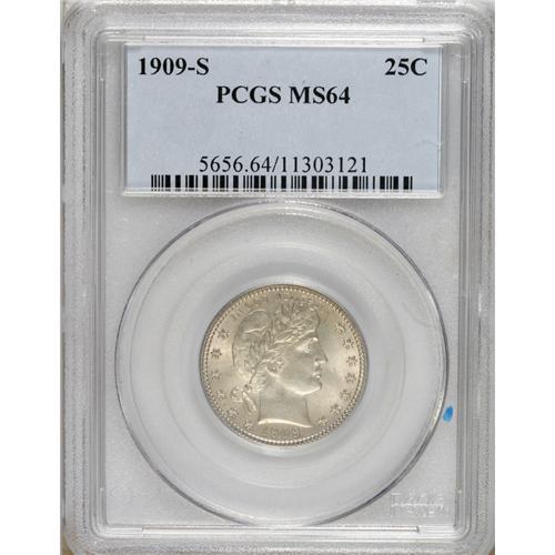 <B>1909-S 25C MS64 PCGS.</B></I> Light tan-gray toning. Well struck save for the base of the fletchings, and the satiny surfaces are uncommonly clean, particularly on the reverse. The upper half of the mintmark is repunched. Boldly clashed beneath Liberty's ear. Population: 20 in 64, 32 finer (2/07).<BR><BR><b>Shipping:</b> Coins & Currency (<a target="_blank" href="http://www.heritageauctions.com/common/shipping.php">view shipping information</a>)