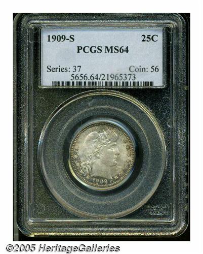 <B>1909-S<25C> MS64 PCGS.</B></I> This scarce date Barber quarter features lustrous surfaces and well struck design elements. Dappled russet and cobalt-blue patina gravitates to the peripheries, especially on the obverse. A couple of luster grazes and short pinscratches are noted on Liberty's neck, and a small indention is located on the cheek. Light as-struck roller marks traverse Liberty's portrait.