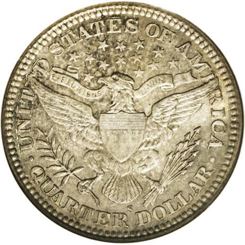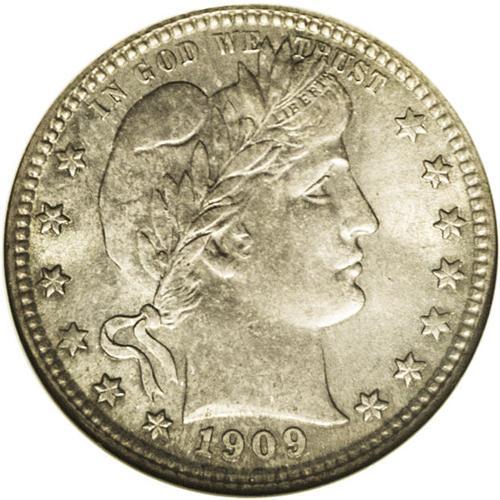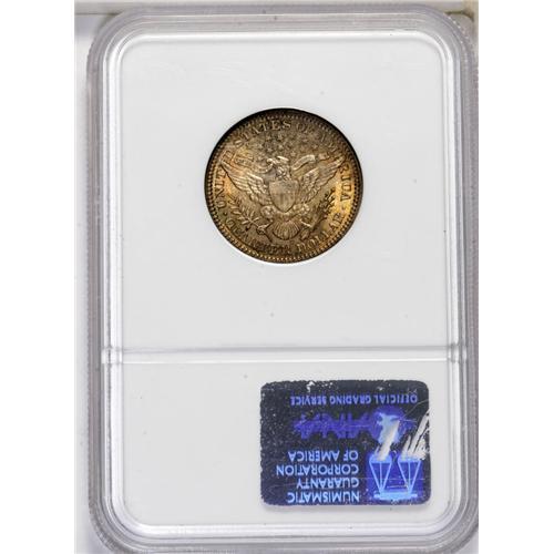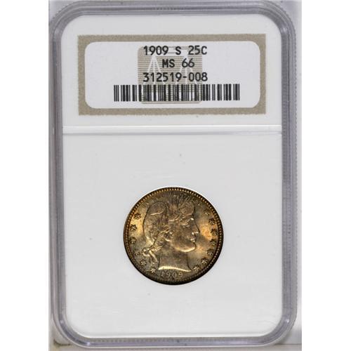 <B>1909-S<25C> MS66 NGC.</B></I> The 1909-S is a somewhat underrated date in the Barber quarter dollar series. Examples in the better grades of Mint State are difficult to come by, as is brought out by the population figures. Only about 30 specimens have been certified as Premium Gems by NGC and PCGS, and a mere five coins have graded higher (6/06). This MS66 piece displays dusky lilac, sky-blue, and apricot-gold over lustrous surfaces that exhibit sharply impressed design features. Some milling marks on Liberty's neck are within the confines of the grade designation.