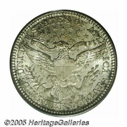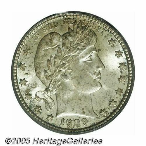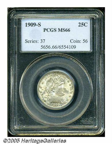 <B>1909-S<25C> MS66 PCGS.</B></I> The 1909-S is a very scarce and underrated issue in AU condition, and as one might imagine, in MS66 it is extremely rare. Only 13 other pieces have been so graded by PCGS with one finer (5/05). This particular piece has dazzling mint luster (an obvious S-mint product), and there is a significant amount of original brilliance still in evidence although a fine speckling of golden-gray toning is sprinkled over each side as well. Sharply struck, there are no obvious or distracting marks on either side of this lustrous premium Gem. Population: 13 in 66, 1 finer (5/05).<BR><I>From The Western Hills Collection.</B></I>