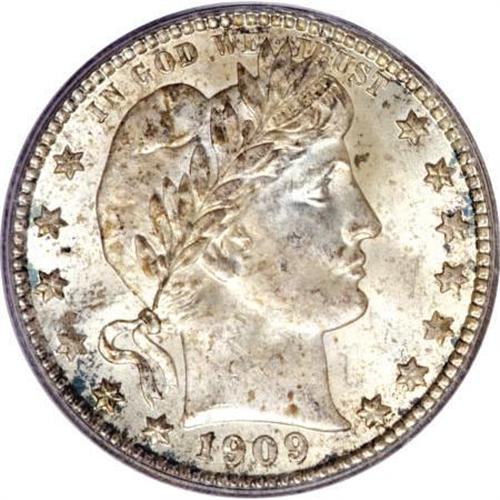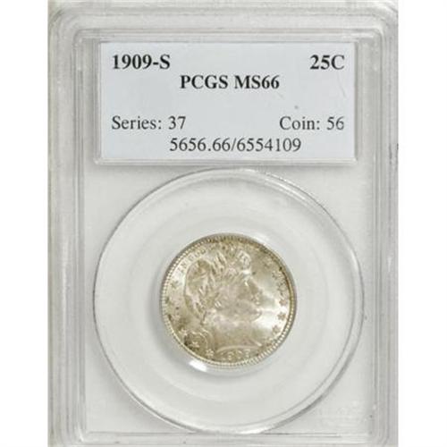 <B>1909-S 25C MS66 PCGS.</B></I> The 1909-S is a very scarce and underrated issue in AU condition, and as one might imagine, in MS66 it is extremely rare. This particular piece has dazzling mint luster, and there is a significant amount of original brilliance still in evidence, although a fine speckling of golden-gray toning is sprinkled over each side as well. This sharply struck Premium Gem coin shows no singularly mentionable distractions on either side. Population: 16 in 66, 1 finer (1/08).<BR><I>From The Southwest Collection.</B></I><BR><BR><B>Coin Engraver:</B> Charles E. Barber<BR><BR><b>Shipping:</b> Coins & Currency (<a target="_blank" href="http://www.heritageauctions.com/common/shipping.php">view shipping information</a>)
