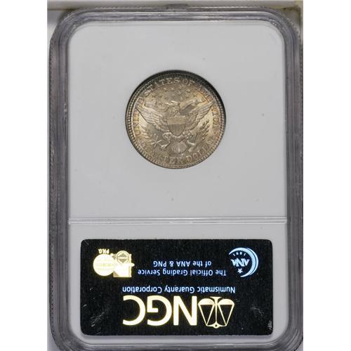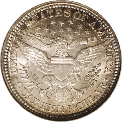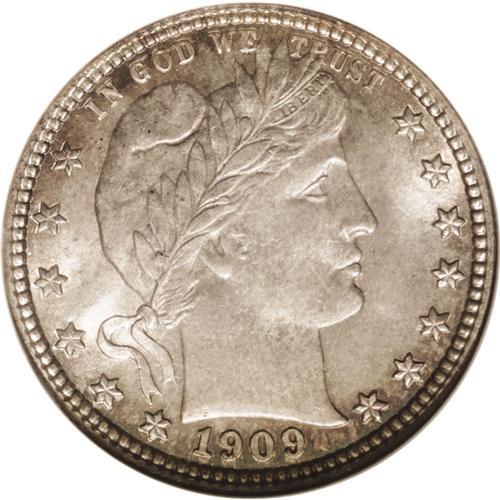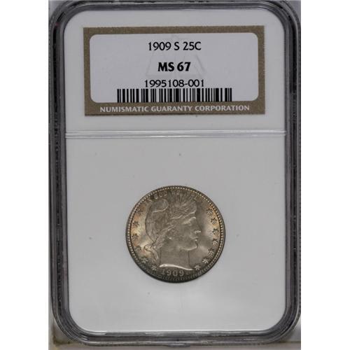 <B>1909-S<25C> MS67 NGC.</B></I> The 1909-S is a scarcer issue among late-date Barber quarters and is one that is seldom located in Superb condition. In fact, only four other pieces have been so graded, three others at NGC and one at PCGS (6/06). As one would expect from a San Francisco product, the mint luster on this piece is outstanding. It has the typical "cartwheel" sheen, and this coupled with the rich gray-golden toning more than compensates for any lack of technical perfection or slight softness of strike.