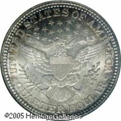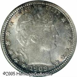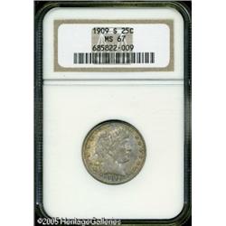 <B>1909-S 25C MS67 NGC.</B></I> This attractively toned Gem is richly frosted with no mentionable striking deficiencies. The surfaces are also expectantly smooth for the assigned grade. Despite a mintage of 1.3 million pieces, the 1909-S is anything but common in better Mint State grades, and, in fact, this coin is the sole Superb Gem to be graded as such by NGC. Population: 1 in 67, 0 finer (1/05). Lot:6625