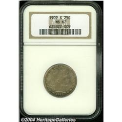 <B>1909-S<25C> MS67 NGC.</B></I> This attractively toned Gem is richly frosted with no mentionable striking deficiencies. The surfaces are also expectantly smooth for the assigned grade. Despite a not insignificant mintage of 1.3 million pieces, the 1909-S is anything but common at the present level of preservation, and, in fact, this coin is the sole Superb Gem to be graded as such by NGC, with none graded any higher. Population: 1 in 67, 0 finer at either service (7/04). <BR><BR><B>Important notice:</B> Heritage usually auctions material at the rate of 200-250 lots per hour. On some occasions eBay Live bid software or the Internet may not be able to keep up with the pace of the auction. We recommend placing a realistic absentee bid now as insurance to avoid disappointment. Occasionally the auctioneer may eliminate or reject an eBay Live bid, and the auctioneer may also reopen a lot after the close of the eBay live bidding (usually because we missed an audience bid), and may reject your bid even if it shows you as the winning bidder. By bidding via eBay Live, you agree that Heritage may award the lot to another bidder at its sole discretion under the circumstances described above or any other reasonable circumstances. Since eBay bids are not shown to us until we open the lot on the floor, we treat those bids just like floor bids. In most cases the floor responds before the eBay bid is presented to us, due to Internet lag time, so for consistency we have made it a policy that floor bids are always considered first over tie eBay live bids. Also please note that all Heritage lots purchased through eBay Live carry a 20% Buyer's Premium. Please make sure you read the Terms and Conditions before you bid. </span></font></tr></table></td></tr></table>