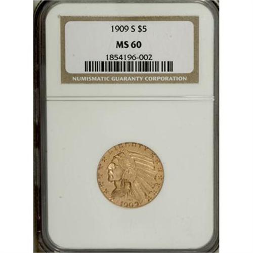 <B>1909-S $5 MS60 NGC.</B></I> The peach-gold surfaces of this unworn S-mint half eagle display soft, swirling luster and occasional green-gold accents. Well struck with a number of moderate abrasions visible in the fields, though the MS60 grade seems harsh for a piece that displays a measure of eye appeal.<BR><BR><b>Shipping:</b> Coins & Currency (<a target="_blank" href="http://www.heritageauctions.com/common/shipping.php">view shipping information</a>)