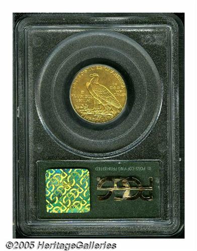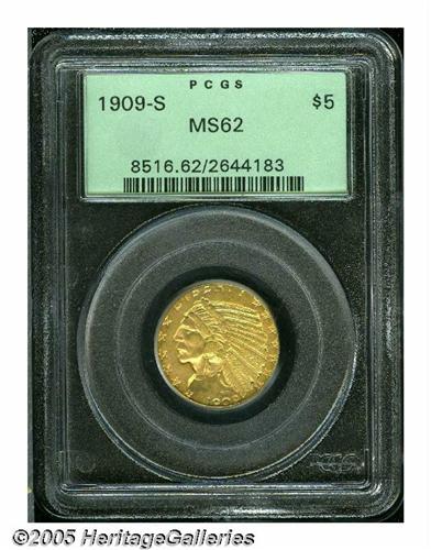 <B>1909-S<$5> MS62 PCGS.</B></I> Fully lustrous and highly attractive for the grade with only a few scattered surface marks. This is a very scarce issue in Mint State grades, with the present example in the optimum grade level for the design type. Coins that grade MS62 are considerably more reasonable in price than those even one point finer, while maintaining nearly equal quality. In fact, this example, in an older PCGS green-label holder, may be worthy of extra consideration due to its quality for the assigned grade. Population: 43 in 62, 39 finer (5/05).