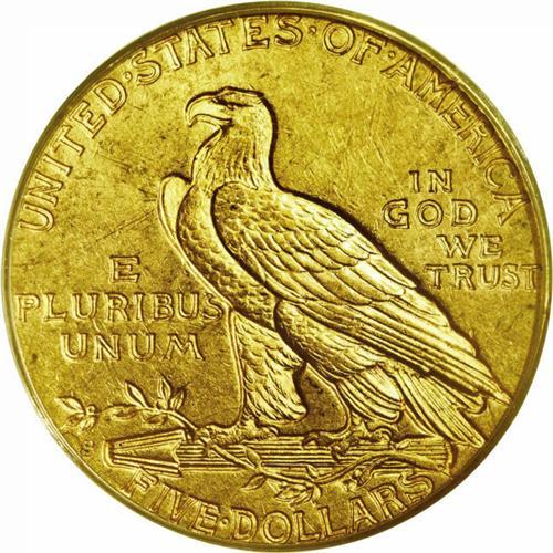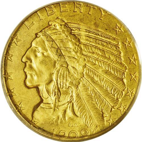 <B>1909-S<$5> MS62 PCGS.</B></I> The 1909-S is a scarce and often-overlooked issue among five dollar Indians. In spite of a generous mintage of 297,500 pieces, very few have survived today in the various grades of Uncirculated. A large number of circulated coins are known, which would indicate that much of the mintage was dropped into circulation. This is a sharply struck example that has the usual frosted mint luster. The surfaces are reddish-golden with occasional dashes of gray patina on each side. Numerous small abrasions account for the grade. Population: 45 in 62, 40 finer (4/06).