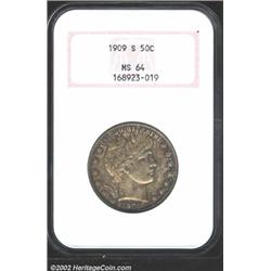 1909-S 50C MS64 NGC. Mottled antique-copper toning overlays both sides with a few hints of russet and electric-blue colors here and there. This is a sharply impressed example with no areas of noteworthy striking incompleteness. The toning adequately conceals what few abrasions are present, and a couple of reverse spots are noted solely for accuracy. Despite a higher mintage, the 1909-S (1.7 million coins produced) is scarcer than the 1909-O (925,400 pieces produced) in most grades, and this is the first near-Gem that we have offered this year.From the Ohio Collection. Important notice: We expect to be auctioning lots at the rate of 200-250 per hour. Sometimes eBay Premier live bid software cannot keep up with that pace, so we strongly recommend that you place a realistic proxy bid now as insurance to avoid disappointment. Also please note that all Heritage/CAA lots purchased through eBay Premier carry a 20% Buyer's Premium. Please make sure you read the Terms and Conditions.