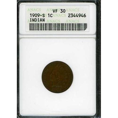 <b>1909-S Indian Head Cent. ANACS graded VF30 BR.</b> Low mintage rarity in the Indian cent series, only 309,000 minted <b>(PCGS # 2238)</b>