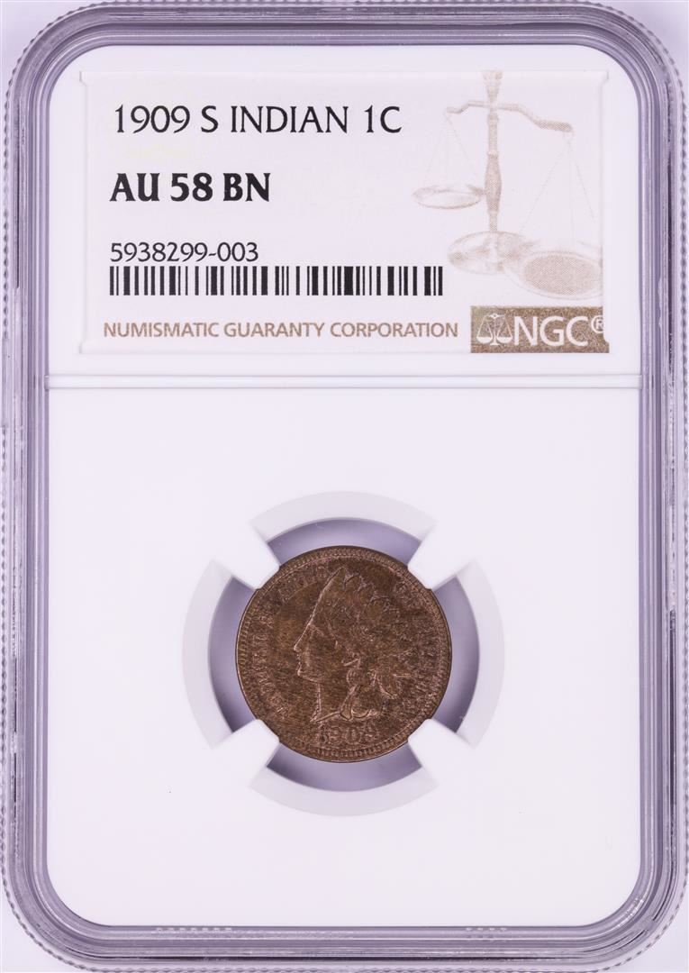 One 1909-S Indian Head Cent Coin NGC AU58 BN. NGC Certified.