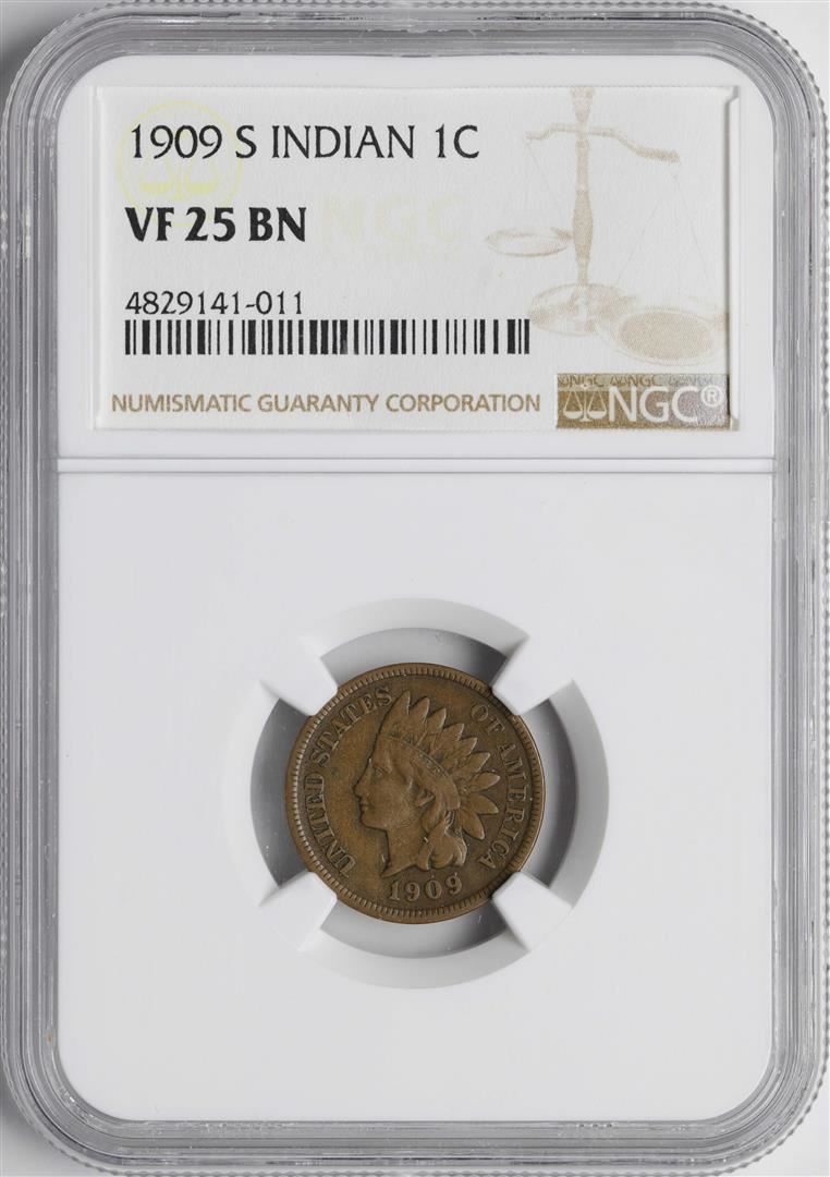 One 1909-S Indian Head Cent Coin NGC VF25 BN. NGC Certified.